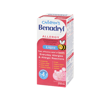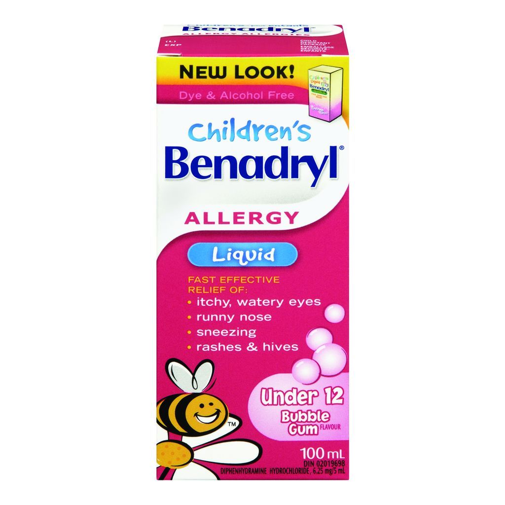 Great tasting bubblegum flavoured Children's BENADRYL® Liquid provides fast, effective symptom relief of your child’s everyday allergies and allergic reactions. Children's BENADRYL® Liquid is free of both dyes and alcohol.