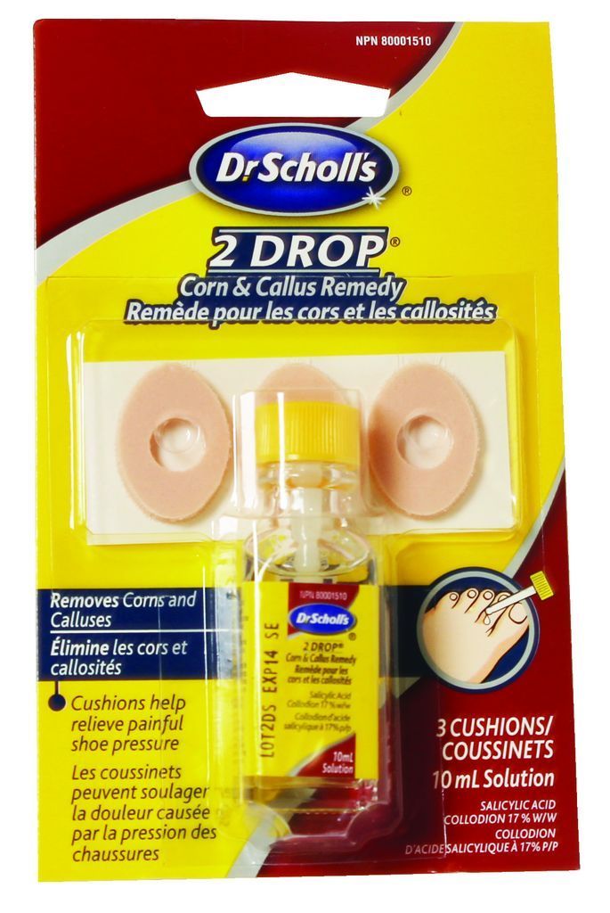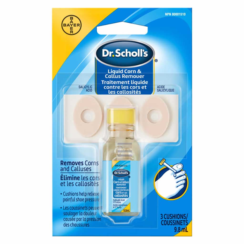 Dr. Scholl’s® Liquid Corn/Callus Remover is specifically for people who have painful corns and/or calluses on their feet. The medicated liquid removes corns and calluses safely and effectively, while the cushions relieve painful shoe pressure and friction.