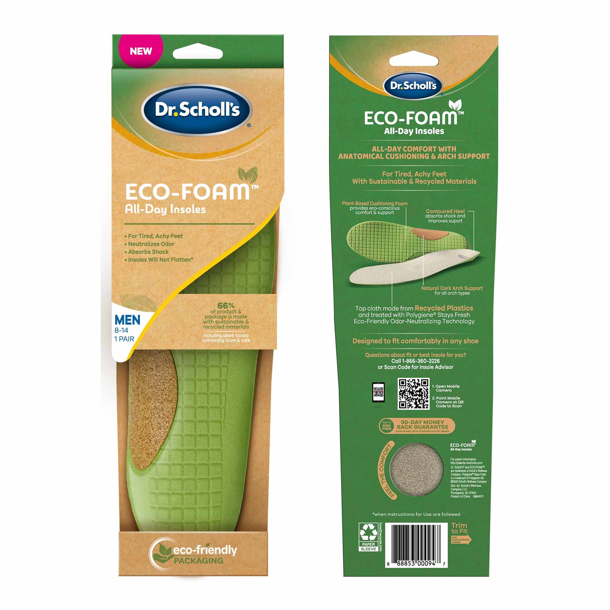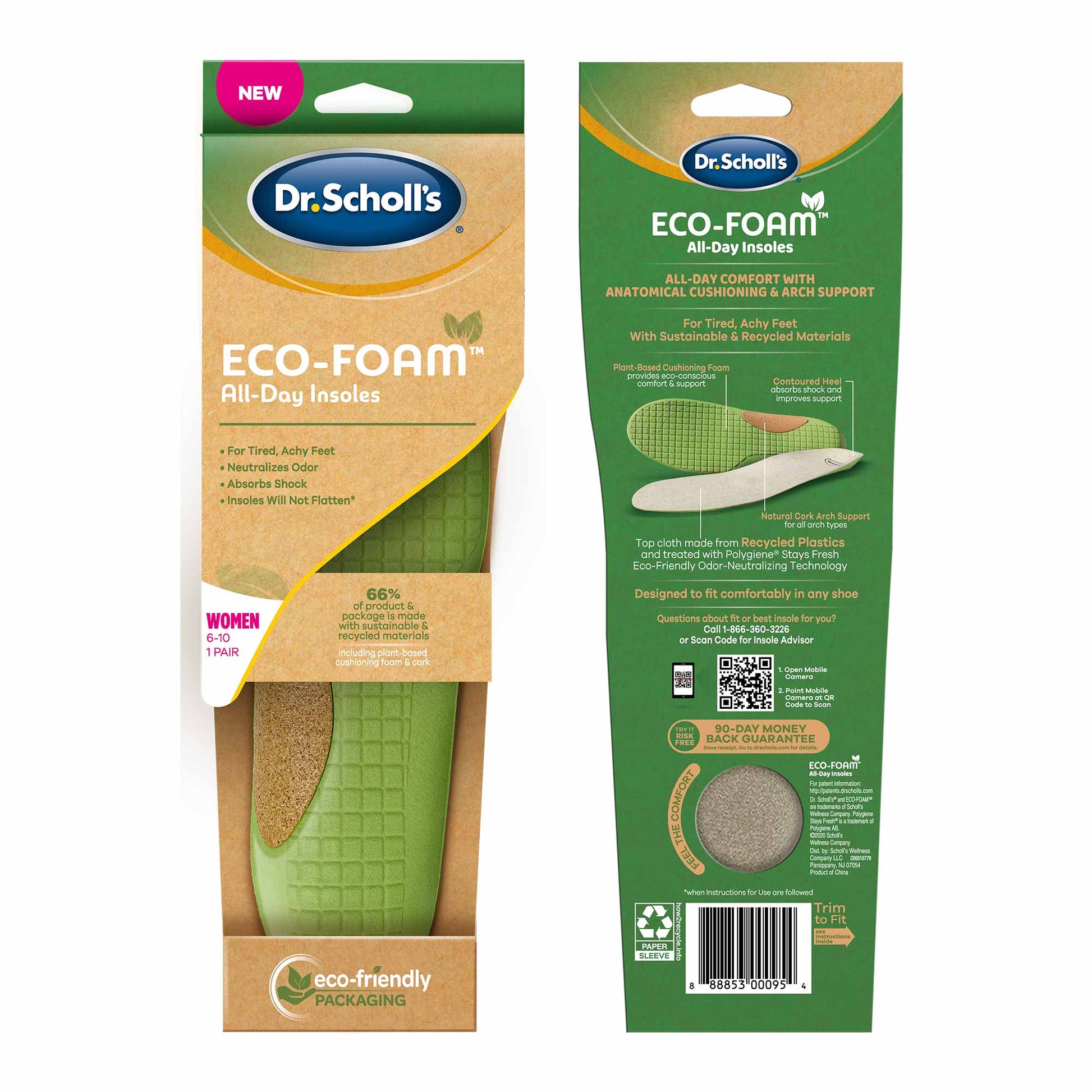 We designed Dr. Scholl’s® Eco-Foam™ All-Day Insoles to provide the support your feet need all day long with an eco-friendly design. The insoles combine recycled materials and plant-based oils to provide foam cushioning made for all-day wear and support from tired, achy feet. Experience our most eco-friendly insole while still receiving the support and quality you expect from Dr. Scholl’s®.