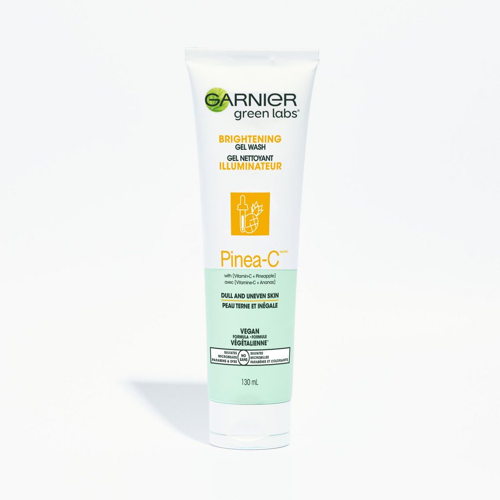 Garnier Green Labs Brightening Gel Wash is a gentle scrub-free facial cleanser. This pure gel formula, with Pineapple and Vitamin C, removes makeup and impurities, and works to improve dull, uneven skin for skin that is smoother, brighter and glowing. This vegan facial cleanser is suitable for all skin types and skin tones, allergy tested & dermatologist tested for safety and suitable for sensitive skin. No sulfates, microbeads, parabens, or dyes.