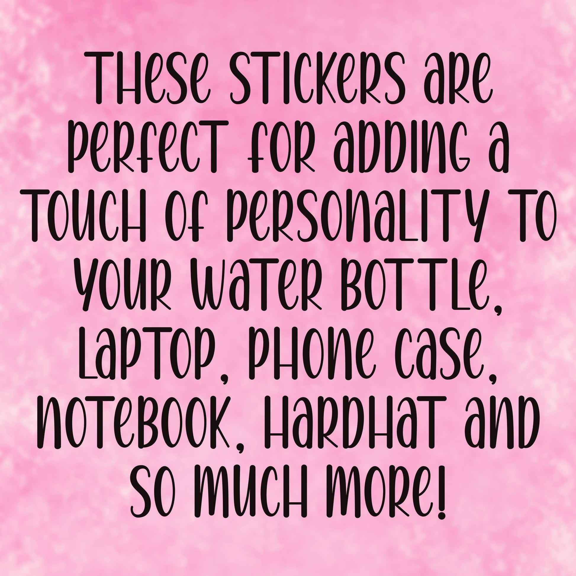 These high-quality vinyl stickers are a perfect addition to any store! They’re great for impulse buys and often become conversation starters, with customers returning for more after a good laugh. Each sticker measures 3" on the longest side and is made from durable vinyl and laminate for added protection. Handmade by me in my home office, I personally print, laminate, cut, and inspect each sticker to ensure top-notch quality for all my retailers. Water-resistant and versatile, these stickers are ideal for decorating items like water bottles, laptops, tablets, journals, phone cases, gaming consoles, hard hats, tool boxes, and more! You can display them loose (the most popular option, which looks great on clear sticker shelves or at checkout), individually packaged, or individually packaged with a hang hole. *Individual packaging measures 4x6".