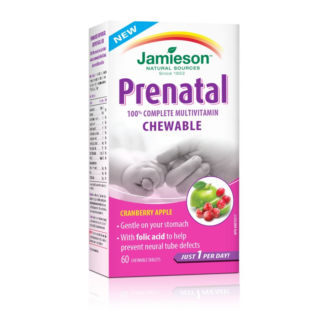 Jamieson 100% Complete Chewable Prenatal Multivitamin is the first chewable prenatal multivitamin in Canada that provides 100% or more of the vitamins recommended for pregnant women in just one pill per day! It is also enriched with iron, iodine, and folic acid to ensure expecting and nursing mothers are getting the essential nutrients they need for their baby's overall health.