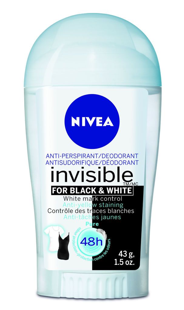 For clear 48-hour sweat protection, choose NIVEA Black & White Invisible. 5-in-one protection: Not only keeps white marks and yellow stains in check, it also fights against odour, sweat, and irritation.