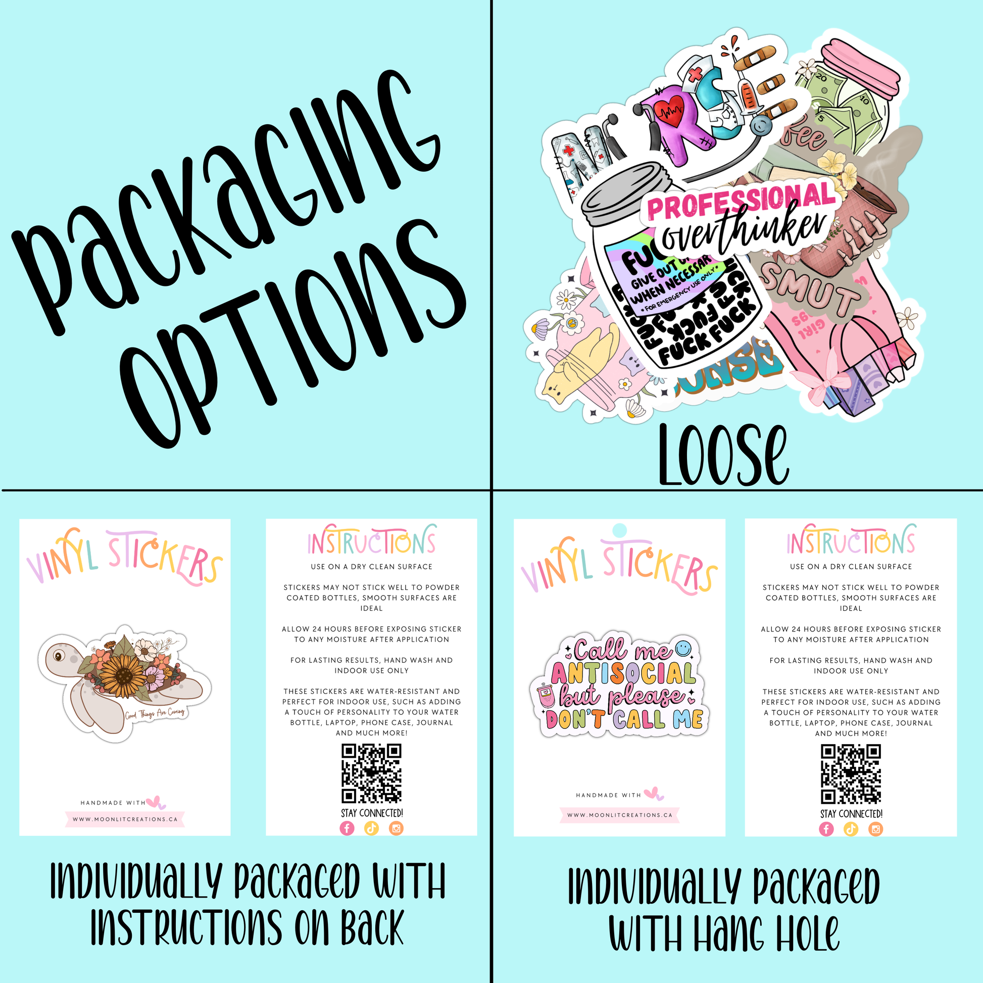 These high-quality vinyl stickers are a perfect addition to any store! They’re great for impulse buys and often become conversation starters, with customers returning for more after a good laugh. Each sticker measures 3" on the longest side and is made from durable vinyl and laminate for added protection. Handmade by me in my home office, I personally print, laminate, cut, and inspect each sticker to ensure top-notch quality for all my retailers. Water-resistant and versatile, these stickers are ideal for decorating items like water bottles, laptops, tablets, journals, phone cases, gaming consoles, hard hats, tool boxes, and more! You can display them loose (the most popular option, which looks great on clear sticker shelves or at checkout), individually packaged, or individually packaged with a hang hole. *Individual packaging measures 4x6".