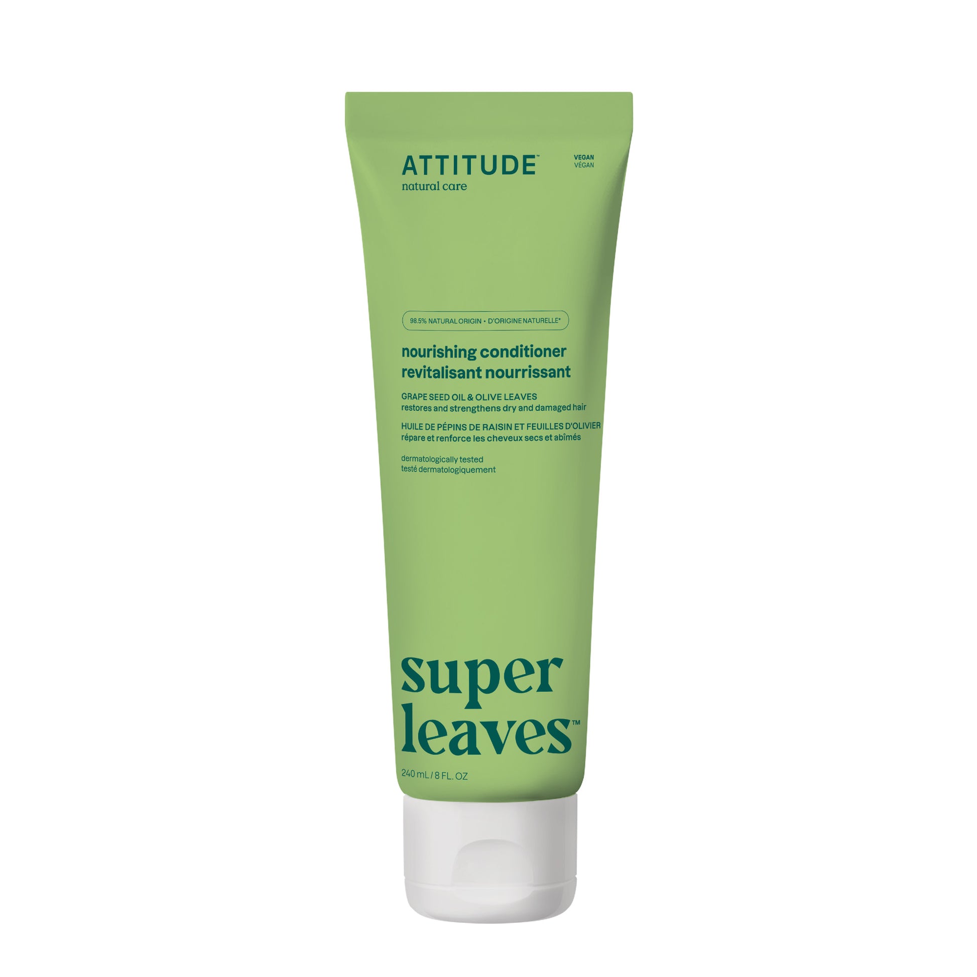 Did you know olives are rich in healthy fats and antioxidants? As a matter of fact, olive leaves are also loaded with these healthy nutrients. With its aroma that reminds us of pear and ginger, ATTITUDE’s Super leaves™ Nourishing and Strengthening Conditioner combines the goodness of olive leaves with grapeseed oil, widely used for its healing and moisturizing properties. Ideal for dry and damaged hair, this conditioner helps to restore and strengthen distressed locks. EWG Verified™, hypoallergenic and dermatologically-tested, our Nourishing & Strengthening Conditioner includes moringa seed extract, known for its antipollution properties. For better damage repair results, use our Nourishing & Strengthening Shampoo before applying the Conditioner. For beautiful hair, from root to end!