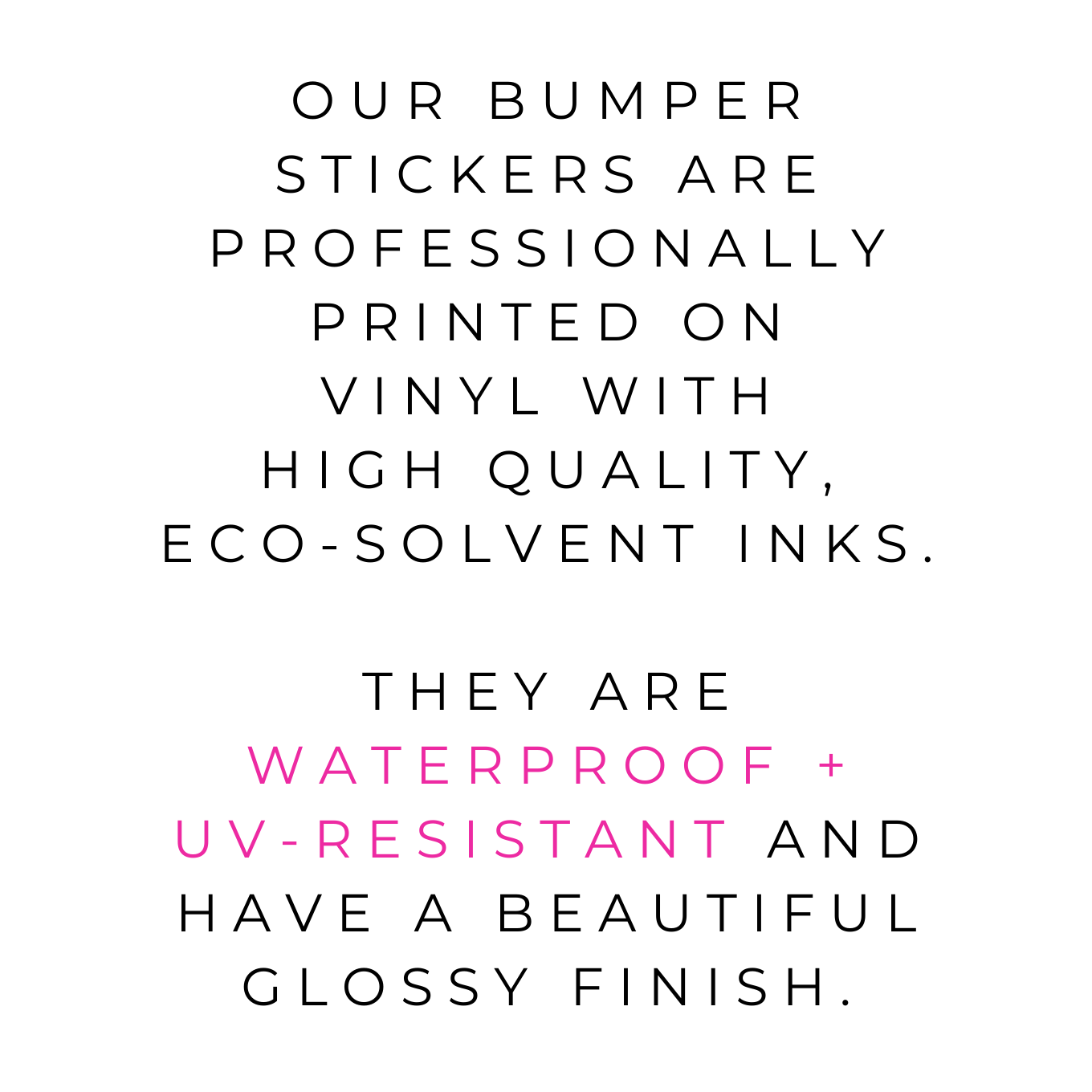 This vinyl car bumper sticker is approximately 8.5" long on its longest side and has a glossy finish. It is professionally printed with high quality, eco-solvent ink so it is waterproof and uv resistant!