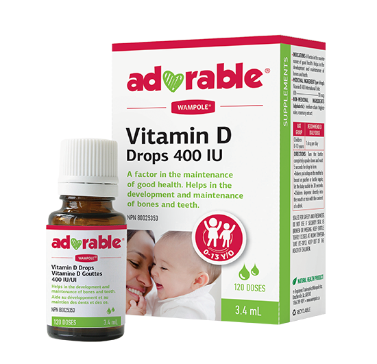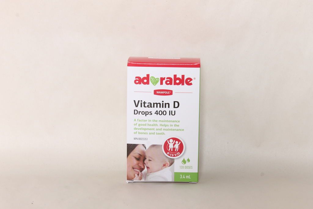 The 120 drops VITAMIN D supplement of ADORABLE is practical and perfectly balanced for children 0 to 13 years old: 400 IU per 1 drop or 1 dose per day.